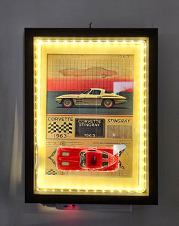 Într-o ramă elegantă de lemn vopsită în negru, încadrată cu sticlă, este expusă macheta retro a unui Chevrolet Corvette din 1963. Decorul include detalii retro ce subliniază frumusețea și autenticitatea acestui model istoric. Rama este iluminată cu un LED cu senzor de mișcare, aducând un plus de eleganță și accentuând liniile inconfundabile ale mașinii.
