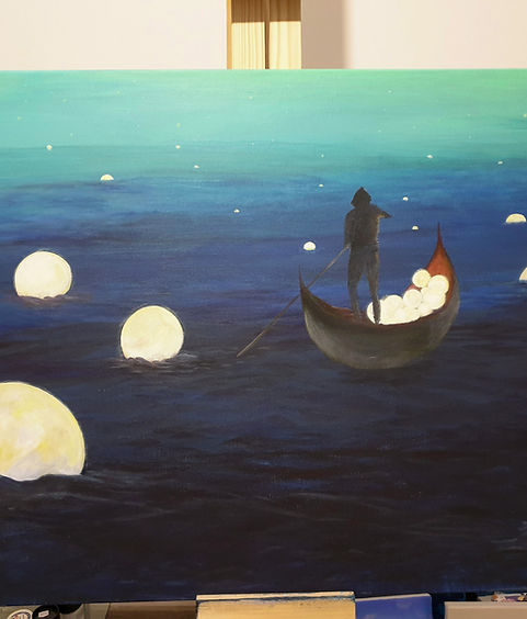 "Harvesting Moonlight" este o pictură captivantă în acril pe pânză care înfățișează un bărbat într-o barcă, plutind pe o mare liniștită în miez de noapte. Tonurile profunde de la miezul nopții ale apei se îmbină perfect cu cerul înstelat, creând un fundal etereal. Bărbatul, învăluit într-o strălucire argintie, adună cu grijă luni luminoase în barca sa, ca și cum ar culege o recoltă cerească. Fiecare lună, cu lumina sa blândă, se reflectă în apa calmă de dedesubt, adăugând o notă de vis scenei. Această pictură invită privitorii într-un moment liniștit, aproape ireal, unde natura și cosmosul se împletesc într-o călătorie nocturnă pașnică, dar misterioasă.
